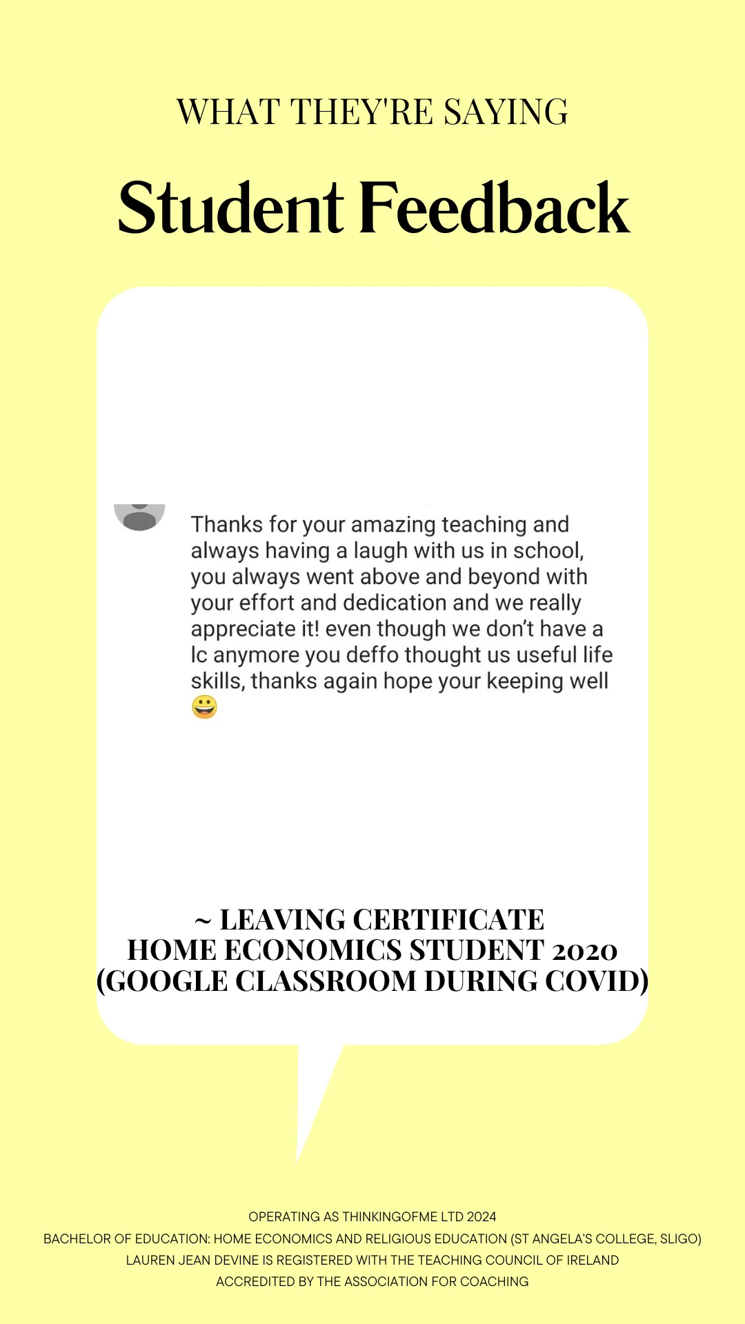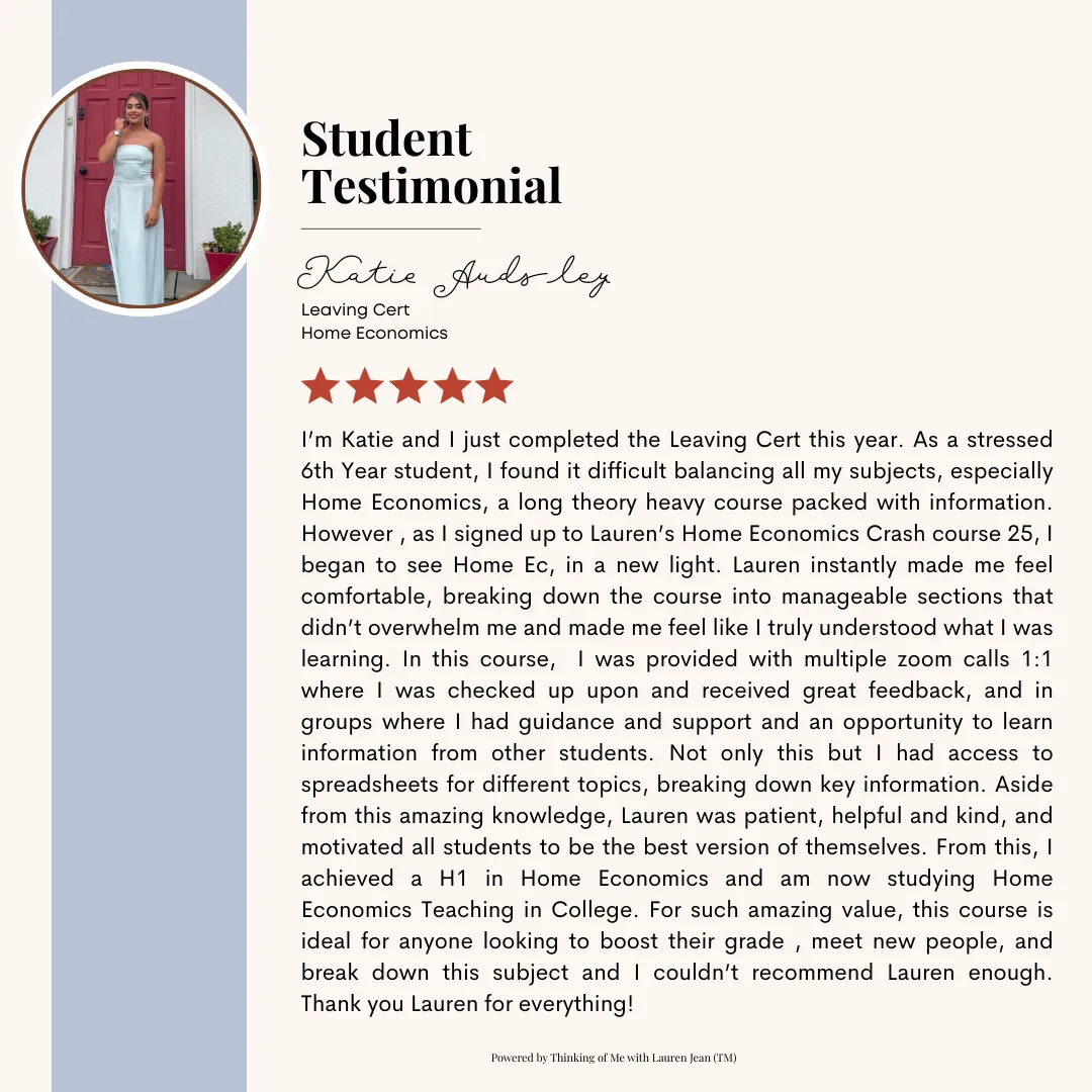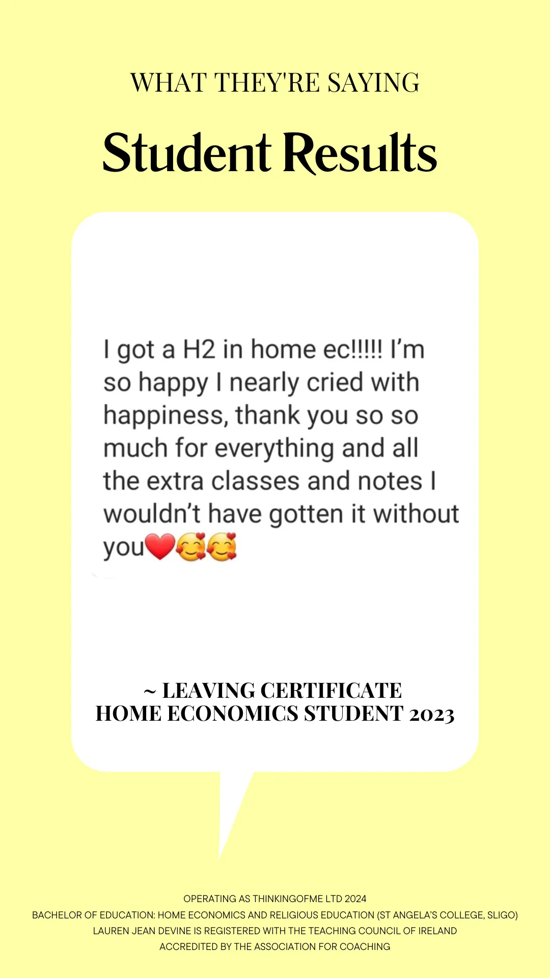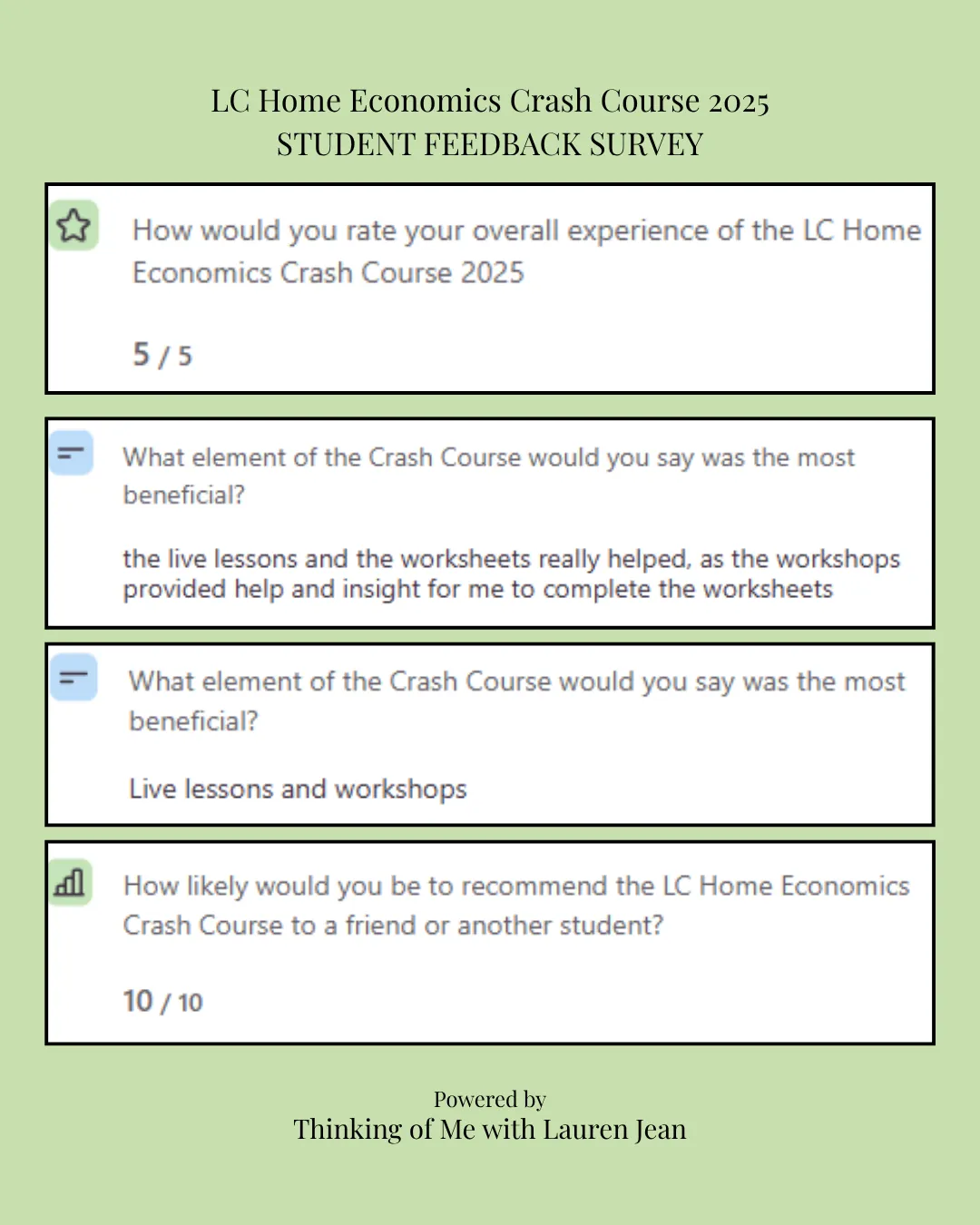 I found the home ec crash course extremely beneficial. Lauren is extremely helpful and considerate and explains things in immense detail during the live lessons. my teacher was absent for a lot of 6th year so I felt a bit behind, but I caught up extremely fast with the crash course. The worksheets aided me in my study and Lauren was always there if I had a question. As a student I have little discretionary spending but this crash course was very reasonably priced for the notes and live lessons I received, so it was worth every penny! After the course I was more confident in my ability and I had lots of confidence walking into the exam. I 100% recommend it to any lc home economist!💖